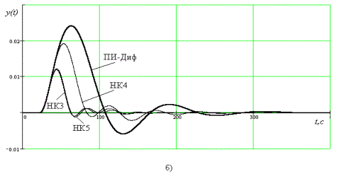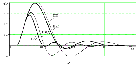 Переходные процессы в рассмотренных выше АСР при единичном ступенчатом возмущении по каналу регулирующего органа с настроечными параметрами и показателями качества работы, в соответствии с табл. 1,2 , представлены на рис.7 а, б.