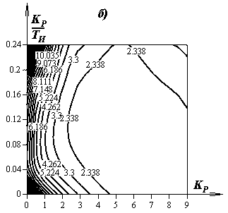 Для всех интегральных критериев в плоскости настроечных параметрах регулятора наблюдаются области с минимальными значениями. Наиболее очевидный и предсказуемый характер имеют квадратичный интеграл (рис. 1, б) и интеграл по модулю (рис 1, в).
