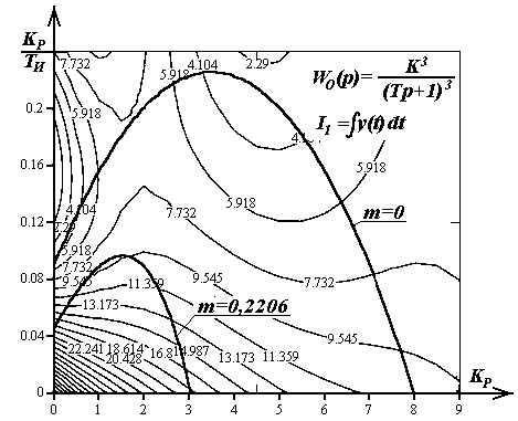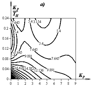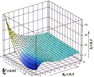 Расчеты, проведенные для сравнительно простого объекта (3) и одноконтурной АСР с ПИ-регулятором, показали, что поверхность отклика даже простейших интегральных критериев качества в пространстве настроечных параметров имеет достаточно сложный вид (рис.1).
