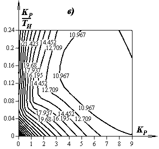 Рис.1. Плоскости параметров ПИ-регулятора с линиями равных уровней интегральных показателей качества регулирования а) - линейный; б) - квадратичный; в) - по модулю